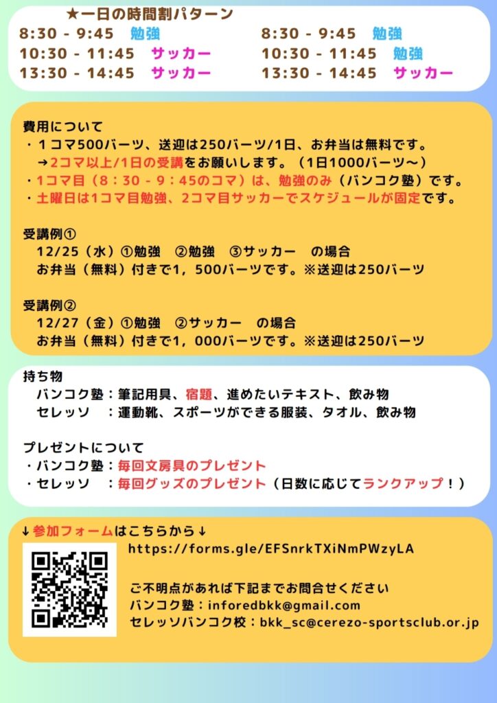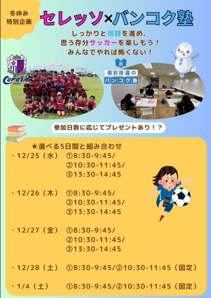 冬休み特別企画「 セレッソ×バンコク塾」 投稿日: 2024年11月26日2024年11月28日 投稿者: creerfcweb 冬休み中、朝からしっかりと宿題を進め、そのあと思う存分サッカーを楽しんでもらおうと思います。サッカー未経験者からプロサッカー選手を目指す少年少女まで、一人一人に合わせた指導をいたします。また、躾(一生懸命取り組む・仲間を大切にする・話は目を見て聞く・行動を早くする・挨拶は目を見てする)の成長を促します。 参加日数に応じてプレゼントも用意しています。 下記フォームからお申し込みお願いいたします。 https://forms.gle/uwyrnbwTP9TYPXQj8