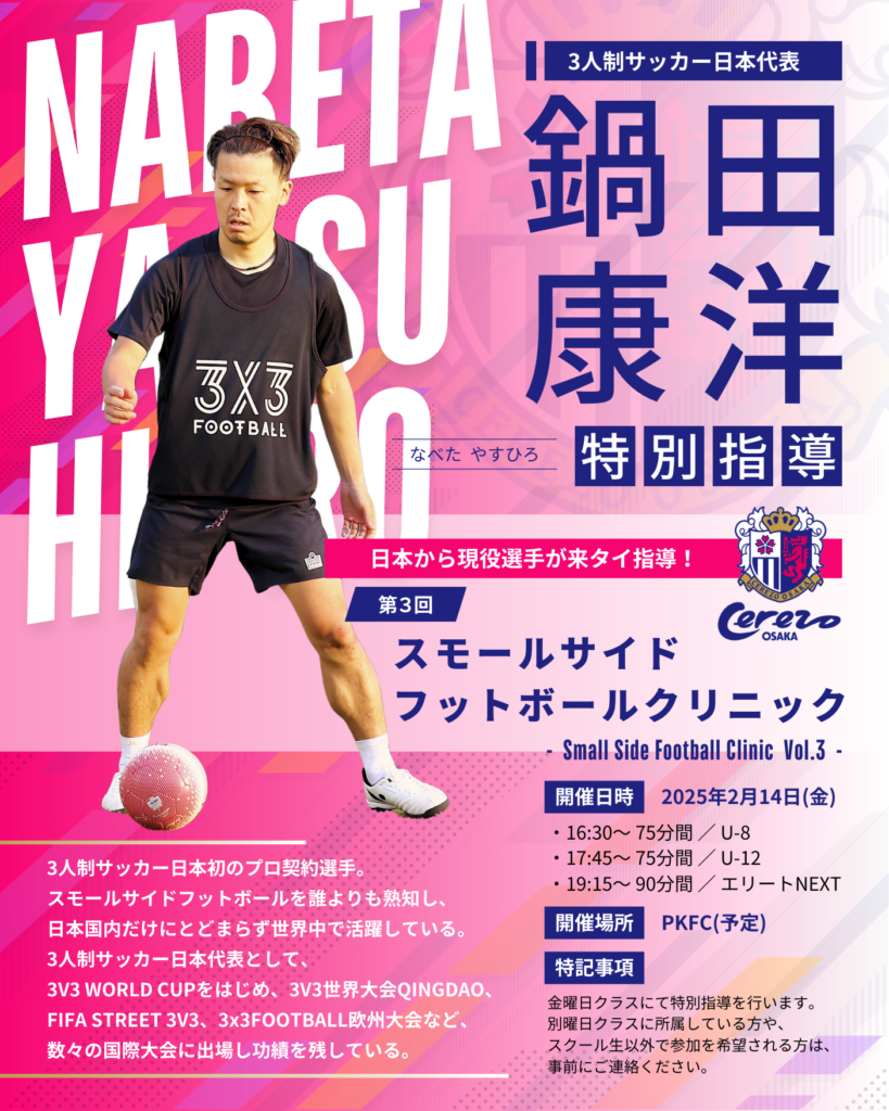 【鍋田選手第3段スペシャルclinic】 投稿日: 2025年1月24日2025年2月9日 投稿者: creerfcweb 日本から現役選手が来タイ指導!局面打開!ドリブル・ボールキープを学ぶ! 鍋田康洋選手による『スモールサイドフットボールクリニック』1,2回目が大好評だったため、セレッソ大阪バンコク校スクール生のために、また来タイしてくださいます🔥 今回は金曜クラスに参加してくれます🌸 また2/12(水)もバンコク校活動にも参加してくれます。たくさんのご参加お待ちしてます。 詳しくは朴コーチまで🌸