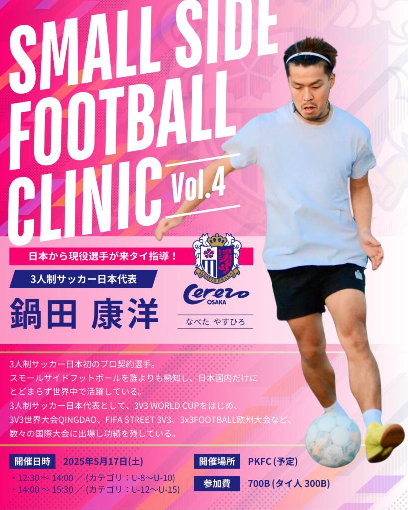 【鍋田選手第4段スペシャルclinic】 投稿日: 2025年5月1日2025年5月8日 投稿者: creerfcweb 日本から現役選手が来タイ指導!局面打開!ドリブル・ボールキープを学ぶ!@yasuhiro_nabeta 鍋田康洋選手による『スモールサイドフットボールクリニック』 第1~3回目が大好評だったため、セレッソ大阪バンコク校スクール生のために、また来タイしてくださいます🔥たくさんのご参加お待ちしてます。 詳しくは朴コーチまで🌸