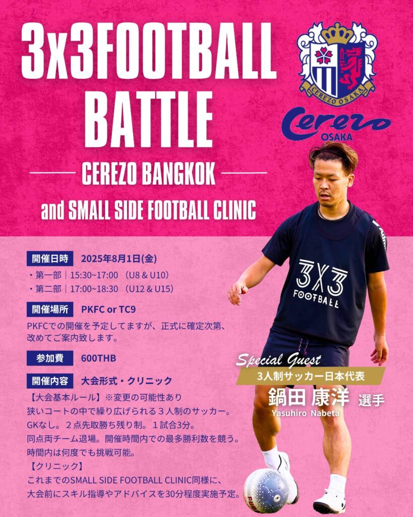 【鍋田選手第5段スペシャルclinic】 投稿日: 2025年7月1日2025年7月15日 投稿者: creerfcweb 日本から現役選手が来タイ指導!局面打開!ドリブル・ボールキープを学ぶ!@yasuhiro_nabeta 鍋田康洋選手による『3×3 Football battle and small side football clinic』 今回第5回目は、セレッソ大阪バンコク校スクール生で3×3 Football battleを開催してもらいます⚽🔥たくさんのご参加お待ちしてます。 詳しくは朴コーチまで🌸